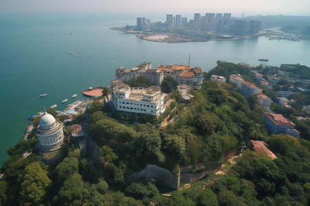 Generative AI : Aerial view of a small wealthy residential district on the cliffs kat Redhill Peninsula along the coastline on Hong Kong Island