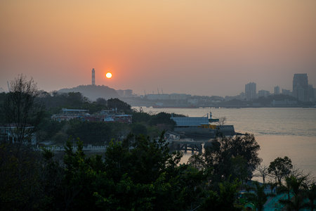 Xiamen city viewed from Gulangyu island in Fujian, China.
