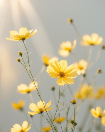 AI Generated. Yellow Cosmos Flowers in Soft Sunlight Spring Bloom