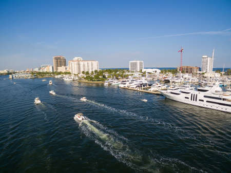 Boats floating in Fort Lauderdale bay, Florida USA. Aerial view.