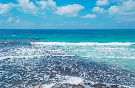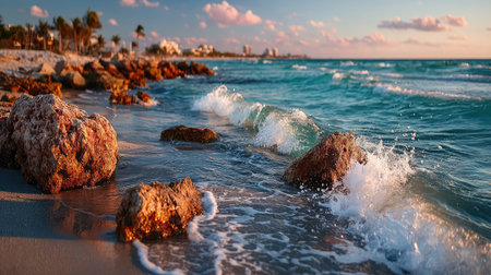 A captivating coastal view featuring turquoise waves crashing against rugged rocks, evoking a sense of serenity and natural beauty in an outdoor setting.