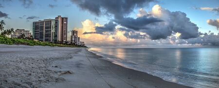 High rise buildings in the distance on North Naples Beach at sunrise in Naples, Florida