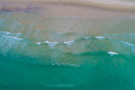 Seaside scenery drone view. Summer holiday destination. Sandy beach. Teal blue water.