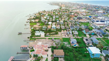 Downtown South Padre Island and waterfront residential neighborhood along Gulf Coast, Laguna Bay, expensive beach villa, mansion houses with swimming pool, private wooden jetty boat ramp pier. USA