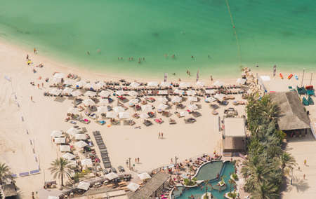 Sunny vacation in Dubai. Beach with tourists. View from a height.