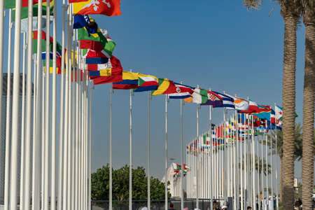 Many world flags flying in a row outside of expo center in 2020 waving on blue sky background