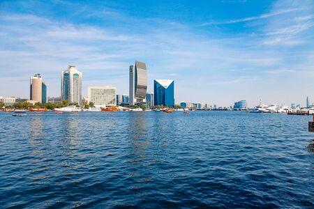 Rich famous scyscrapers and yachts on sea canal