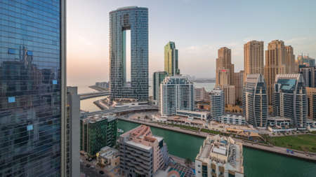 Sunrise in Dubai Marina with modern towers and harbor with yacht from skyscrapper, Dubai, UAE timelapse 4K wide angle top view with clouds on the sky