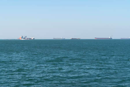 Suez, Egypt - November 5, 2017: Commercial ships southbound through the Great Bitter Lake and wait in line at anchor. This is where the North and South convoys pass.