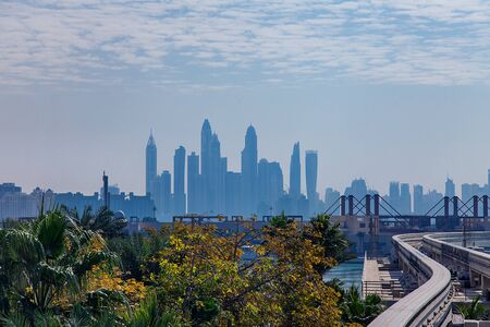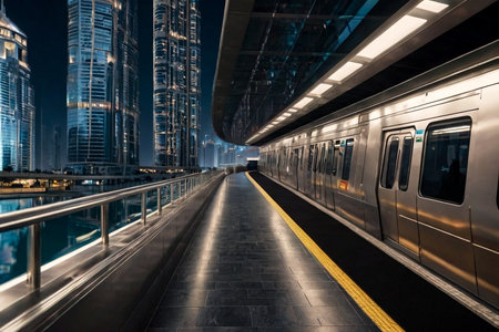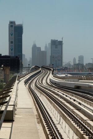 Subway of Dubai view among glass skyscrapers in business district, urban background. Wallpaper of metropolitan city metro in arabic desert country. Public transportation concept. Copy ad text space