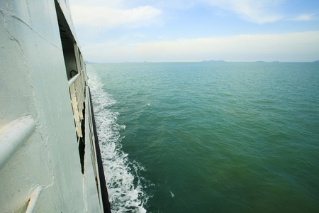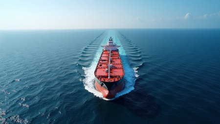 Oil tanker ship sailing through ocean with foamy trail clear sky in background
