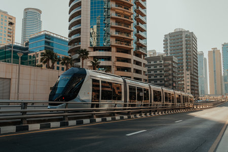 Dubai, United Arab Emirates - November 06, 2021: Dubai metro train on rails at background of skyscrapers. Famous outdoor subway Red Line