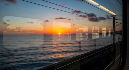 A scenic view seen through a train window, featuring a vibrant sunset over a calm ocean horizon. The interior of the train carriage is faintly reflected in the glass, blending travel with the landscape.