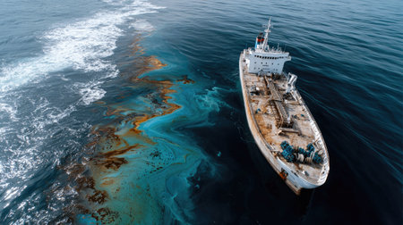 Oil spill from a ship in the sea, highlighting ocean pollution and the dangerous impact of maritime accidents with a focus on environmental hazards