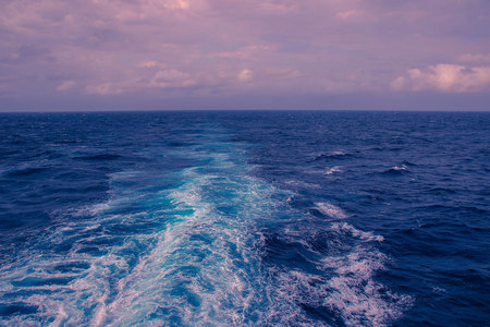 Wake of a ship across Ocean while sailing into the Norwegian fjords, on a beautiful day. Purple and blue light reflecting on the sea and waves. Cruising the Baltic, North Sea and fjords, Northern Europe.