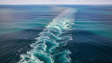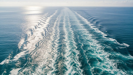 Wake showing expansive view of deep blue ocean water with sunlight reflecting and creating rippling waves and a distinct wake trail on the surface. keywords: ocean,...