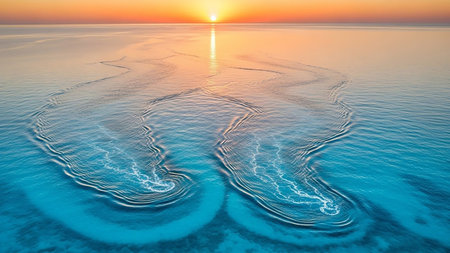 Aerial view of vibrant turquoise ocean water with swirling patterns from boat wakes, illuminated by the glowing orange sunset and its reflection on the horizon.