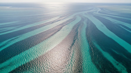 Surface showing aerial drone view of turquoise and deep blue ocean water with visible sandbars and currents creating abstract wavy patterns and lines under bright...