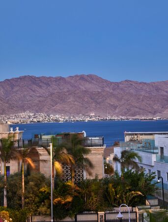 Editorial: EILAT, ISRAEL, April 25, 2017 - Eilat and the mountains of the Sinai seen from Aqaba, Jordan
