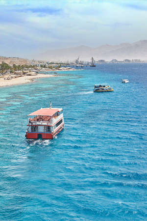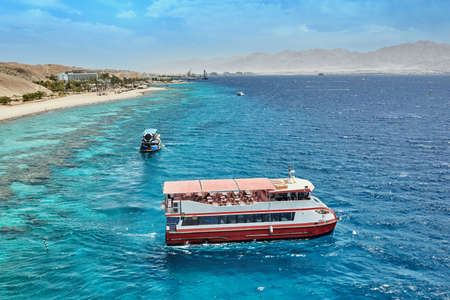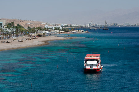 Aqaba, Jordan - November 6, 2017: Red Sea with a tourist wooden glass boat on Al-Ghandour Beach in Aqaba, Jordan.