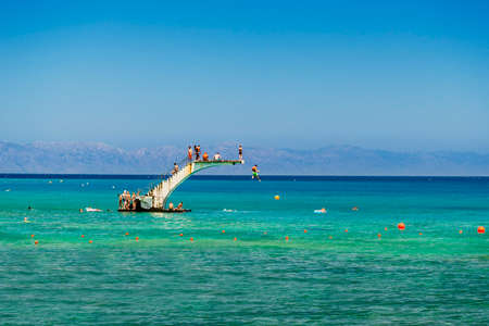 Rocky beach with a floating pier in the Gulf of Eilat Red Sea. Israel