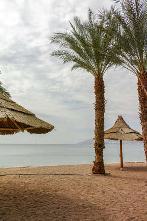 Beach, palm, sea and pier in the water on a cloudy summer day in Jordan
