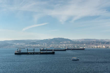Eilat, Israel - November 7, 2017: View from cargo port of Eilat in Israel on Jordanian mountains and anchored ships at the gulf of Aqaba (Red Sea). Tourist boats sail in the bay.