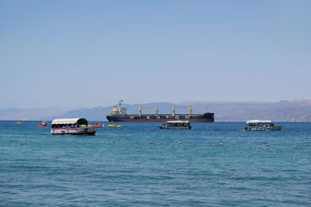 Aqaba, Jordan - November 6, 2017: Ships are anchored in the Red Sea and the Eilat, Israel at the foot of the mountains in the background in Aqaba, Jordan.