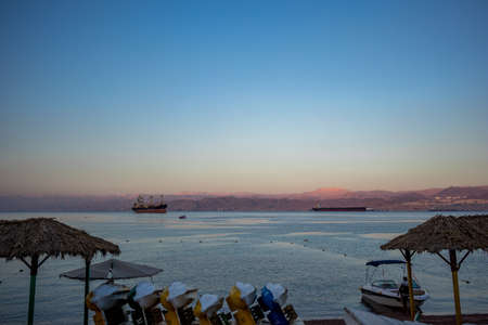 Aqaba, Jordan - 09.01.2021: Scenic view at sunset with the beach in Aqaba. Outodoor tables and chairs and boats on the beach.