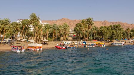 Aqaba, Jordan - circa June 2022: Beach with local boats on the Red Sea in Aqaba, Jordan