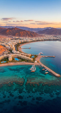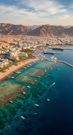 top view aerial photography of the most south Israeli city Eilat near Gulf of Aqaba Red sea bay with Jordanian desert and mountains