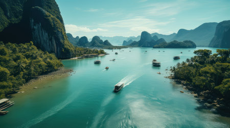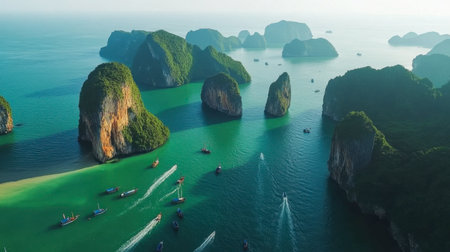 A stunning aerial view of Phang Nga Bay, showcasing the iconic limestone karsts emerging from emerald waters, with boats dotting the landscape.