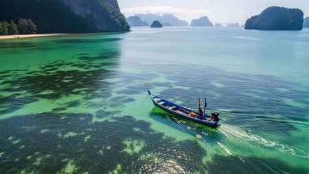 Aerial view of a boat on the sea in Krabi, Thailand