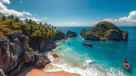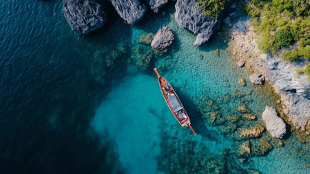 This stunning aerial view captures a traditional wooden boat resting in vibrant turquoise waters, framed by rocky cliffs and verdant vegetation, evoking a sense of tranquility and adventure in a tropical paradise.