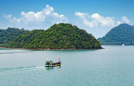 Travel to Don Sak over turquoise water in tropical landscape via ferry Surat Thani Thailand.