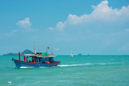 Small fishing boat is floating on the sea near the beach in a sunny day