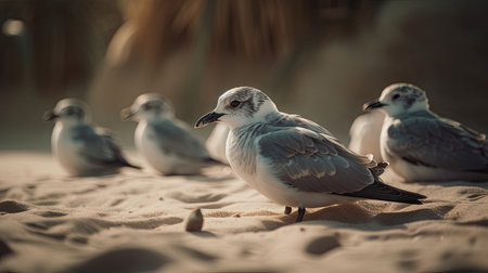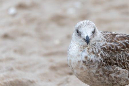 Portrait of a herring gull Larus argentatus on the beach. Its sharp gaze and soft plumage are captured in natural light.