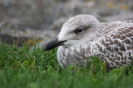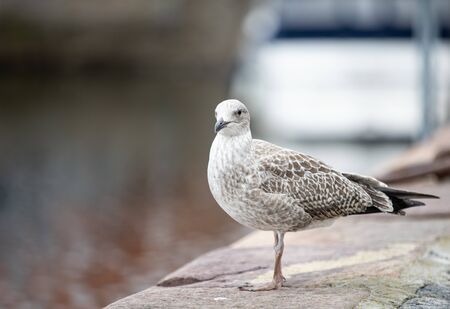 Close-up of young mottled brown European Herring Gull stands close to a stone wall.