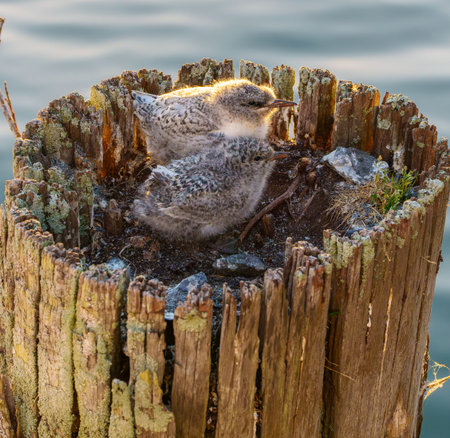 Baby white-fronted tern or sterna striata birds in nest on top of pole on Tauranga waterfront.