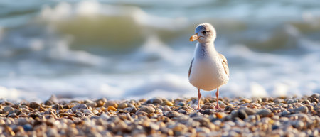A seagull stands on a pebbly beach as ocean waves gently crash in the background. The scene captures a peaceful coastal moment at sunset.