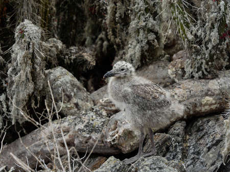Dominican gull chick sitting on the rocks of the Antarctic Islands