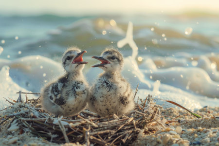 Two baby birds are sitting on a nest on the beach. They are chirping and seem to be enjoying the view of the ocean