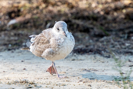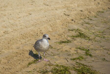 A young european herring gull (Larus argentatus) standing on the beach, sunny day in summer, northern France
