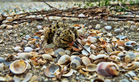 A nestling of European oyster catcher (Haematopus ostralegus) in a nest (a hole in the sand and cardium) on the islands of Lake Sivash, Arabatskaya Strelka spit