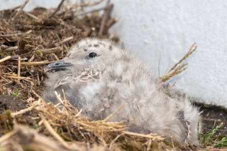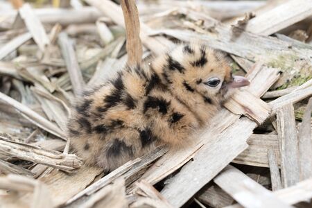 Close-up of a Black-headed gull, Chroicocephalus ridibundus, small chicks leaving the nest