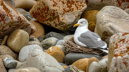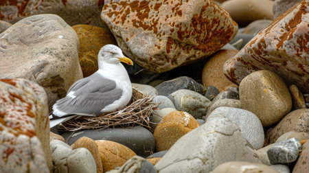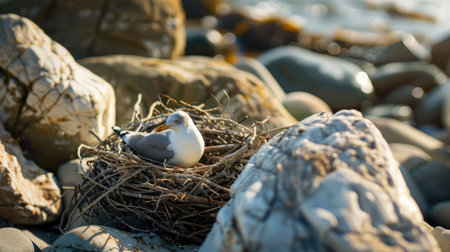 A seabird with a sharp beak, part of the Charadriiformes order, is perched on a rock nest made of natural materials on the bedrock soil landscape AIG50