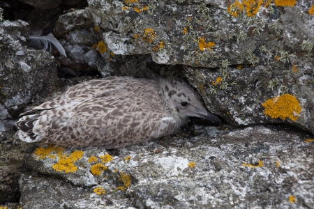 Nestling gull in the nest, Isla Magdalena, Patagonia, Chile