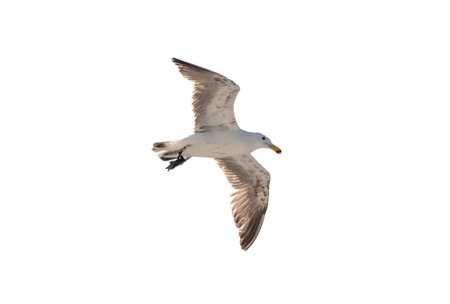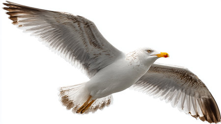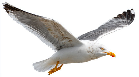 A detailed image of a seagull in mid-flight, captured against a white background. The bird is prominently displayed with its wings spread wide, showcasing its grey and white feathers with black tips. The seagull's yellow beak and legs are clearly visible, highlighting its graceful flight. The image is SEO-friendly and ideal for nature and wildlife enthusiasts.
