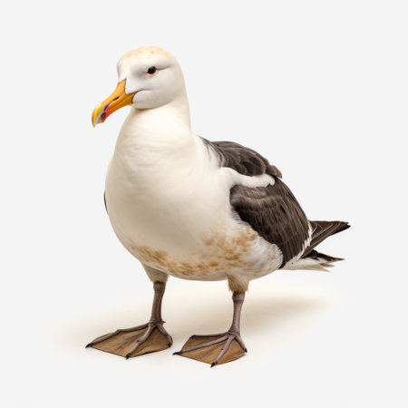 black-browed albatross sitting down in the style of ambrosius bosschaert, late afternoon beautiful colours, golden hour lighting on a clear and white background. wide angle full body shot on clear and white background. ai generated
