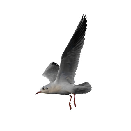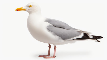 An isolated seagull captures attention with its sleek form and vivid coloring, set against a pure white background.